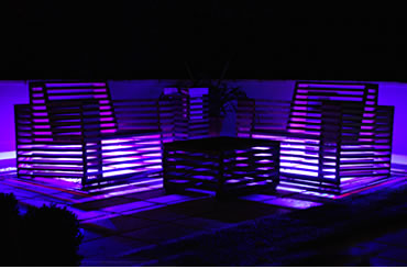The furniture comes to life at dusk with a sophisticated remote controlled lighting system linking the chairs on the lower level with the sofa set high above. |